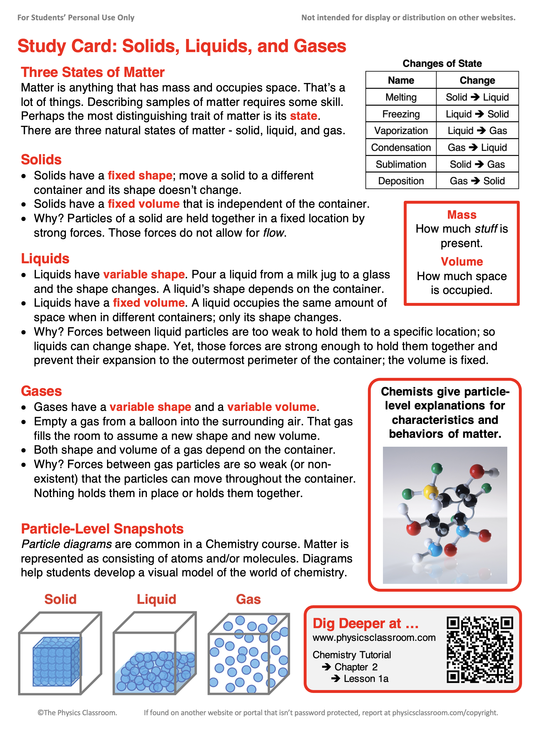 - Download our Study Card on Solids, Liquids, and Gases. Save it to a safe location and use it as a review tool.