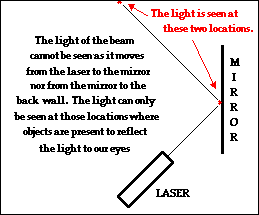 A common Physics demonstration involves the directing of a laser beam across the room. With the room lights off, the laser is turned on and its beam is directed towards a plane mirror. The presence of the light beam cannot be detected as it travels towards the mirror. Furthermore, the light beam cannot be detected after reflecting off the mirror and traveling through the air towards a wall in the room. The only locations where the presence of the light beam can be detected are at the location where the light beam strikes the mirror and at the location where the light beam strikes a wall. At these two locations, a portion of the light in the beam is reflecting off the objects (the mirror and the wall) and traveling towards the students' eyes. And since the detection of objects is dependent upon light traveling from that object to the eye, these are the only two locations where one can detect the light beam. But in between the laser and the mirror, the light beam cannot be detected. There is nothing present in the region between the laser and the mirror that is capable of reflecting the light of the beam to students' eyes.