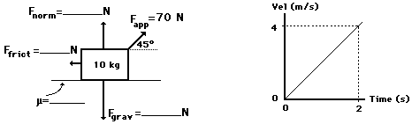 5. The following object is being pulled at a constant speed of 2.5 m/s. Use your understanding of force relationships and vector components to fill in the blanks in the following diagram and to determine the net force and acceleration of the object. (Fnet = m•a; Ffrict = μ•Fnorm; Fgrav = m•g)