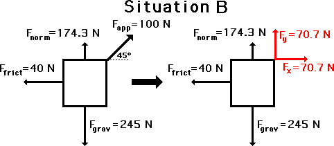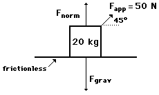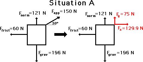 Consider the situation below in which a force is directed at an angle to the horizontal. In such a situation, the applied force could be resolved into two components. These two components can be considered to replace the applied force at an angle. By doing so, the situation simplifies into a familiar situation in which all the forces are directed horizontally and vertically.