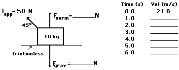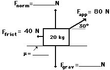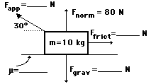11. Use your understanding of force relationships and vector components to fill in the blanks in the following diagram and to determine the net force and acceleration of the object. (Fnet = m•a; Ffrict = μ•Fnorm; Fgrav = m•g)