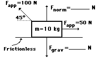The following problems provide plenty of practice with Fnet= m • a problems involving forces at angles. Try each problem and then click the button to view the answers.