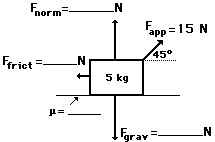 6. Use your understanding of force relationships and vector components to fill in the blanks in the following diagram and to determine the net force and acceleration of the object. (Fnet = m•a; Ffrict = μ•Fnorm; Fgrav = m•g)