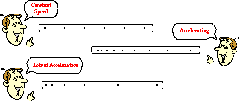 The analysis of a dot diagram will also reveal if the object is moving with a constant velocity or accelerating. A changing distance between dots indicates a changing velocity and thus an acceleration. A constant distance between dots represents a constant velocity and therefore no acceleration. Dot diagrams for objects moving with a constant velocity and with an accelerated motion are shown below.