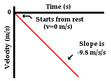 Observe that the line on the graph is a straight, diagonal line. As learned earlier, a diagonal line on a velocity versus time graph signifies an accelerated motion. Since a free-falling object is undergoing an acceleration (g = 9,8 m/s/s, downward), it would be expected that its velocity-time graph would be diagonal. A further look at the velocity-time graph reveals that the object starts with a zero velocity (as read from the graph) and finishes with a large, negative velocity; that is, the object is moving in the negative direction and speeding up. An object that is moving in the negative direction and speeding up is said to have a negative acceleration (if necessary, review the vector nature of acceleration). Since the slope of any velocity versus time graph is the acceleration of the object (as learned in Lesson 4), the constant, negative slope indicates a constant, negative acceleration. This analysis of the slope on the graph is consistent with the motion of a free-falling object - an object moving with a constant acceleration of 9.8 m/s/s in the downward direction.