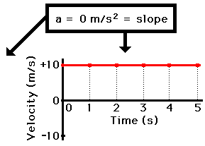 The velocity-time data and graph would look like the graph below. Note that the line on the graph is horizontal. That is the slope of the line is 0 m/s/s. In this case, it is obvious that the slope of the line (0 m/s/s) is the same as the acceleration (0 m/s/s) of the car.