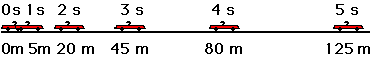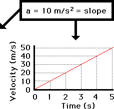 The velocity-time data for this motion show that the car has an acceleration value of 10 m/s/s. (In Lesson 6, we will learn how to relate position-time data such as that in the diagram above to an acceleration value.) The graph of this velocity-time data would look like the graph below. Note that the line on the graph is diagonal - that is, it has a slope. The slope of the line can be calculated as 10 m/s/s. It is obvious once again that the slope of the line (10 m/s/s) is the same as the acceleration (10 m/s/s) of the car.