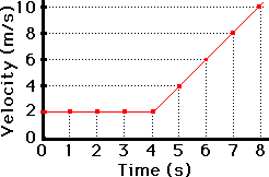 In both instances above - the constant velocity motion and the changing velocity motion, the slope of the line was equal to the acceleration. As a last illustration, we will examine a more complex case - a two-stage motion. Consider the motion of a car that first travels with a constant velocity (a=0 m/s/s) of 2 m/s for four seconds and then accelerates at a rate of +2 m/s/s for four seconds. That is, in the first four seconds, the car is not changing its velocity (the velocity remains at 2 m/s) and then the car increases its velocity by 2 m/s per second over the next four seconds. The velocity-time data and graph are displayed below. Observe the relationship between the slope of the line during each four-second interval and the corresponding acceleration value.