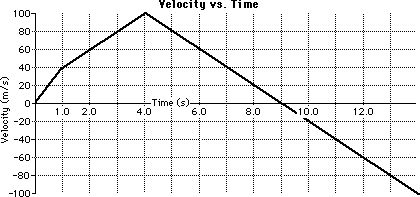 The velocity-time graph for a two-stage rocket is shown below. Use the graph and your understanding of slope calculations to determine the acceleration of the rocket during the listed time intervals. When finished, use the buttons to see the answers. (Help with Slope Calculations)