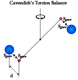 Cavendish's apparatus for experimentally determining the value of G involved a light, rigid rod about 2-feet long. Two small lead spheres were attached to the ends of the rod and the rod was suspended by a thin wire. When the rod becomes twisted, the torsion of the wire begins to exert a torsional force that is proportional to the angle of rotation of the rod. The more twist of the wire, the more the system pushes backwards to restore itself towards the original position. Cavendish had calibrated his instrument to determine the relationship between the angle of rotation and the amount of torsional force. A diagram of the apparatus is shown below.