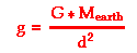 The above equation demonstrates that the acceleration of gravity is dependent upon the mass of the earth (approx. 5.98x1024 kg) and the distance (d) that an object is from the center of the earth. If the value 6.38x106 m (a typical earth radius value) is used for the distance from Earth's center, then g will be calculated to be 9.8 m/s2. And of course, the value of g will change as an object is moved further from Earth's center. For instance, if an object were moved to a location that is two earth-radii from the center of the earth - that is, two times 6.38x106 m - then a significantly different value of g will be found. As shown below, at twice the distance from the center of the earth, the value of g becomes 2.45 m/s2.