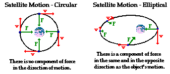 The orbits of satellites about a central massive body can be described as either circular or elliptical. As mentioned earlier in Lesson 4, a satellite orbiting about the earth in circular motion is moving with a constant speed and remains at the same height above the surface of the earth. It accomplishes this feat by moving with a tangential velocity that allows it to fall at the same rate at which the earth curves. At all instances during its trajectory, the force of gravity acts in a direction perpendicular to the direction that the satellite is moving. Since perpendicular components of motion are independent of each other, the inward force cannot affect the magnitude of the tangential velocity. For this reason, there is no acceleration in the tangential direction and the satellite remains in circular motion at a constant speed. A satellite orbiting the earth in elliptical motion will experience a component of force in the same or the opposite direction as its motion. This force is capable of doing work upon the satellite. Thus, the force is capable of slowing down and speeding up the satellite. When the satellite moves away from the earth, there is a component of force in the opposite direction as its motion. During this portion of the satellite's trajectory, the force does negative work upon the satellite and slows it down. When the satellite moves towards the earth, there is a component of force in the same direction as its motion. During this portion of the satellite's trajectory, the force does positive work upon the satellite and speeds it up. Subsequently, the speed of a satellite in elliptical motion is constantly changing - increasing as it moves closer to the earth and decreasing as it moves further from the earth. These principles are depicted in the diagram below.