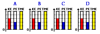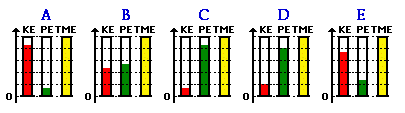 The speed of this satellite is greatest at location A (when the satellite is closest to the earth) and least at location C (when the satellite is furthest from the earth). So as the satellite moves from A to B to C, it loses kinetic energy and gains potential energy. The gain of potential energy as it moves from A to B to C is consistent with the fact that the satellite moves further from the surface of the earth. As the satellite moves from C to D to E and back to A, it gains speed and loses height; subsequently there is a gain of kinetic energy and a loss of potential energy. Yet throughout the entire elliptical trajectory, the total mechanical energy of the satellite remains constant. The work-energy bar chart below depicts these very principles.