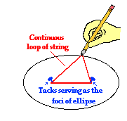 constructed using a pencil, two tacks, a string, a sheet of paper and a piece of cardboard. Tack the sheet of paper to the cardboard using the two tacks. Then tie the string into a loop and wrap the loop around the two tacks. Take your pencil and pull the string until the pencil and two tacks make a triangle (see diagram at the right). Then begin to trace out a path with the pencil, keeping the string wrapped tightly around the tacks. The resulting shape will be an ellipse. An ellipse is a special curve in which the sum of the distances from every point on the curve to two other points is a constant. The two other points (represented here by the tack locations) are known as the foci of the ellipse. The closer together that these points are, the more closely that the ellipse resembles the shape of a circle. In fact, a circle is the special case of an ellipse in which the two foci are at the same location. Kepler's first law is rather simple - all planets orbit the sun in a path that resembles an ellipse, with the sun being located at one of the foci of that ellipse.