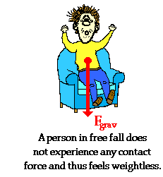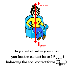 Before understanding weightlessness, we will have to review two categories of forces - contact forces and action-at-a-distance forces. As you sit in a chair, you experience two forces - the force of the Earth's gravitational field pulling you downward toward the Earth and the force of the chair pushing you upward. The upward chair force is sometimes referred to as a normal force and results from the contact between the chair top and your bottom end. This normal force is categorized as a contact force. Contact forces can only result from the actual touching of the two interacting objects - in this case, the chair and you. The force of gravity acting upon your body is not a contact force; it is often categorized as an action-at-a-distance force. The