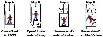 Now consider Otis L. Evaderz who is conducting one of his famous elevator experiments. He stands on a bathroom scale and rides an elevator up and down. As he is accelerating upward and downward, the scale reading is different than when he is at rest and traveling at constant speed. When he is accelerating, the upward and downward forces are not equal. But when he is at rest or moving at constant speed, the opposing forces balance each other. Knowing that the scale reading is a measure of the upward normal force of the scale upon his body, its value could be predicted for various stages of motion. For instance, the value of the normal force (Fnorm) on Otis's 80-kg body could be predicted if the acceleration is known. This prediction can be made by simply applying Newton's second law as discussed in Unit 2. As an illustration of the use of Newton's second law to determine the varying contact forces on an elevator ride, consider the following diagram. In the diagram, Otis's 80-kg is traveling with constant speed (A), accelerating upward (B), accelerating downward (C), and free falling (D) after the elevator cable snaps.