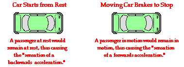 In each case - the car starting from rest and the moving car braking to a stop - the direction which the passengers lean is opposite the direction of the acceleration. This is merely the result of the passenger's inertia - the tendency to resist acceleration. The passenger's lean is not an acceleration in itself but rather the tendency to maintain the state of motion while the car does the acceleration. The tendency of a passenger's body to maintain its state of rest or motion while the surroundings (the car) accelerate is often misconstrued as an acceleration. This becomes particularly problematic when we consider the third possible inertia experience of a passenger in a moving automobile - the left hand turn.
