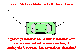sweeps out one-quarter of a circle. The friction force acting upon the turned wheels of the car causes an unbalanced force upon the car and a subsequent acceleration. The unbalanced force and the acceleration are both directed towards the center of the circle about which the car is turning. Your body however is in motion and tends to stay in motion. It is the inertia of your body - the tendency to resist acceleration - that causes it to continue in its forward motion. While the car is accelerating inward, you continue in a straight line. If you are sitting on the passenger side of the car, then eventually the outside door of the car will hit you as the car turns inward. This phenomenon might cause you to think that you are being accelerated outwards away from the center of the circle. In reality, you are continuing in your straight-line inertial path tangent to the circle while the car is accelerating out from under you. The sensation of an outward force and an outward acceleration is a false sensation. There is no physical object capable of pushing you outwards. You are merely experiencing the tendency of your body to continue in its path tangent to the circular path along which the car is turning. You are once more left with the false feeling of being pushed in a direction that is opposite your acceleration.