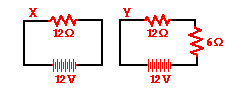 7. Compare circuit X and Y below. Each is powered by a 12-volt battery. The voltage drop across the 12-ohm resistor in circuit Y is ____ the voltage drop across the single resistor in X.
