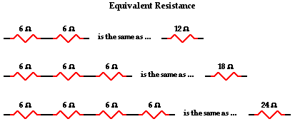 Charge flows together through the external circuit at a rate that is everywhere the same. The current is no greater at one location as it is at another location. The actual amount of current varies inversely with the amount of overall resistance. There is a clear relationship between the resistance of the individual resistors and the overall resistance of the collection of resistors. As far as the battery that is pumping the charge is concerned, the presence of two 6-Ω ;resistors in series would be equivalent to having one 12-Ω resistor in the circuit. The presence of three 6-Ω resistors in series would be equivalent to having one 18-Ω resistor in the circuit. And the presence of four 6-Ω resistors in series would be equivalent to having one 24-Ω resistor in the circuit.