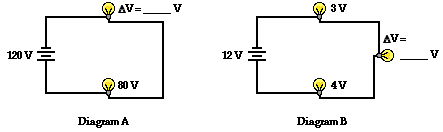 To illustrate this mathematical principle in action, consider the two circuits shown below in Diagrams A and B. Suppose that you were to asked to determine the two unknown values of the electric potential difference across the light bulbs in each circuit. To determine their values, you would have to use the equation above. The battery is depicted by its customary schematic symbol and its voltage is listed next to it. Determine the voltage drop for the two light bulbs and then click the Check Answers button to see if you are correct.