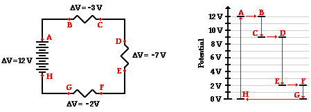 The circuit shown in the diagram above is powered by a 12-volt energy source. There are three resistors in the circuit connected in series, each having its own voltage drop. The negative sign for the electric potential difference simply denotes that there is a loss in electric potential when passing through the resistor. Conventional current is directed through the external circuit from the positive terminal to the negative terminal. Since the schematic symbol for a voltage source uses a long bar to represent the positive terminal, location A in the diagram is at the positive terminal or the high potential terminal. Location A is at 12 volts of electric potential and location H (the negative terminal) is at 0 volts. In passing through the battery, the charge gains 12 volts of electric potential. And in passing through the external circuit, the charge loses 12 volts of electric potential as depicted by the electric potential diagram shown to the right of the schematic diagram. This 12 volts of