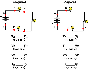 3. Consider the following two diagrams of series circuits. For each diagram, use arrows to indicate the direction of the conventional current. Then, make comparisons of the voltage and the current at the designated points for each diagram.
