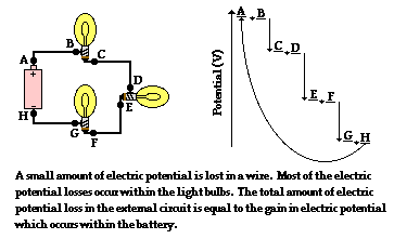 In an electric circuit with several electrical devices, there may be multiple stepwise losses of electric potential as the charge traverses the circuit. There are several ways that multiple devices can be wired within a circuit; this will be the topic of Lesson 4. Regardless of the way in which the devices are wired, the total loss of electric potential of a single charge as it passes through the external circuit is equal to the gain in electric potential that it experiences in the battery. As depicted in the diagram below, a charge carrier traversing the external circuit from A to H passes through three different light bulbs. Each light bulb results in a loss of electric potential for the charge. This loss in electric potential corresponds to a loss of energy as the electrical energy is transformed by the light bulb into light energy and thermal energy. In addition to the changes in electric potential and electric energy that occur in the light bulbs, there is also a smaller amount of electric potential loss in the wires that connect the light bulbs. This small amount of loss in electric potential also corresponds to a small loss of energy as the electrical energy is transformed into thermal energy. The wires get hot - not as hot as the light bulb, but still measurably hot.