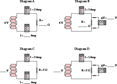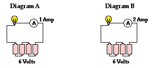 The diagram below depicts a couple of circuits containing a voltage source (battery pack), a resistor (light bulb) and an ammeter (for measuring current). In which circuit does the light bulb have the greatest resistance? Click the See Answer button to see if you are correct.