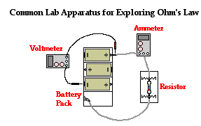 The Ohm's law equation is often explored in physics labs using a resistor, a battery pack, an ammeter, and a voltmeter. An ammeter is a device used to measure the current at a given location. A voltmeter is a device equipped with probes that can be touched to two locations on a circuit to determine the electric potential difference across those locations. By altering the number of cells in the battery pack, the electric potential difference across the external circuit can be varied. The voltmeter can be used to determine this potential difference and the ammeter can be used to determine the current associated with this ΔV. A battery can be added to the battery pack and the process can be repeated several times to yield a set of I-ΔV data. A plot of I versus ΔV will yield a line with a slope that is equivalent to the reciprocal of the resistance of the resistor. This can be compared to the manufacturers stated value to determine the accuracy of the lab data and the validity of the Ohm's law equation.