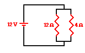 5. A 12-V battery , a 12-ohm resistor and a 4-ohm resistor are connected as shown. The current in the 12-ohm resistor is ____ that in the 4-ohm resistor.