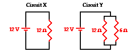 7. A 12-V battery and a 12-ohm resistor are connected as shown in circuit. A 6-ohm resistor is added to the 12-ohm resistor to create circuit Y as shown. The voltage drop across the 6-ohm resistor in circuit Y is ____ that across the resistor in X.