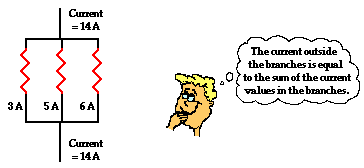 where Itotal is the total amount of current outside the branches (and in the battery) and I1, I2, and I3 represent the current in the individual branches of the circuit.
