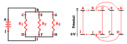 As shown in the electric potential diagram, positions A, B, C, E and G are all at a high electric potential. A single charge chooses only one of the three possible pathways; thus at position B, a single charge will move towards point C, E or G and then passes through the resistor that is in that branch. The charge does not lose its high potential until it passes through the resistor, either from C to D, E to F, or G to H. Once it passes through a resistor, the charge has returned to nearly 0 Volts and returns to the negative terminal of the battery to obtain its voltage boost. Unlike in series circuits, a charge in a parallel circuit encounters a single voltage drop during its path through the external circuit.