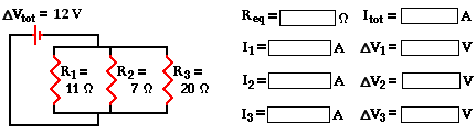 10. Three resistors are connected in parallel. If placed in a circuit with a 12-volt power supply. Determine the equivalent resistance, the total circuit current, and the voltage drop across and current in each resistor.