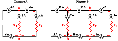 Diagram A displays two resistors in parallel with nodes at point A and point B. Charge flows into point A at a rate of 6 amps and divides into two pathways - one through resistor 1 and the other through resistor 2. The current in the branch with resistor 1 is 2 amps and the current in the branch with resistor 2 is 4 amps. After these two branches meet again at point B to form a single line, the current again becomes 6 amps. Thus we see the principle that the current outside the branches is equal to the sum of the current in the individual branches holds true.