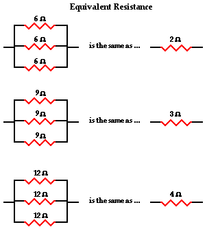 Now let's consider another simple case of having three resistors in parallel, each having the same resistance of 6 Ω. With three equal pathways for charge to flow through the external circuit, only one-third the charge will choose to pass through a given branch. Each individual branch offers 6 Ω of resistance to the charge that passes through it. However, the fact that only one-third of the charge passes through a particular branch means that the overall resistance of the circuit is 2 Ω. As far as the battery that is pumping the charge is concerned, the presence of three 6-Ω resistors in parallel would be equivalent to having one 2-Ω resistor in the circuit. In the same manner, the presence of three 9-Ω resistors in parallel would be equivalent to having one 3-Ω resistor in the circuit. And the presence of three 12-Ω resistors in parallel would be equivalent to having one 4-Ω resistor in the circuit.