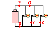 2. Three identical light bulbs are connected to a D-cell as shown below. P, Q, X, Y and Z represent locations along the circuit. Which one of the following statements is true?