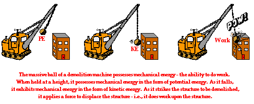 Numerous examples can be given of how an object with mechanical energy can harness that energy in order to apply a force to cause another object to be displaced. A classic example involves the massive wrecking ball of a demolition machine. The wrecking ball is a massive object that is swung backwards to a high position and allowed to swing forward into building structure or other object in order to demolish it. Upon hitting the structure, the wrecking ball applies a force to it in order to cause the wall of the structure to be displaced. The diagram below depicts the process by which the mechanical energy of a wrecking ball can be used to do work.