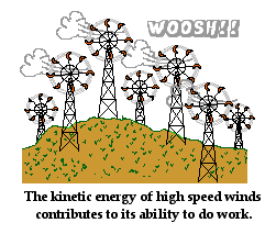 A common scene in some parts of the countryside is a "wind farm." High-speed winds are used to do work on the blades of a turbine at the so-called wind farm. The mechanical energy of the moving air gives the air particles the ability to apply a force and cause a displacement of the blades. As the blades spin, their energy is subsequently converted into electrical energy (a non-mechanical form of energy) and supplied to homes and industries in order to run electrical appliances. Because the moving wind has mechanical energy (in the form of kinetic energy), it is able to do work on the blades. Once more, mechanical energy is the ability to do work.