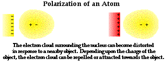 The electrons surrounding the nucleus of an atom are believed to be located in regions of space with specific shapes and sizes. The actual size and shape of these regions is determined by the high-powered mathematical equations common to Quantum Mechanics. Rather than being located a specific distance from the nucleus in a fixed orbit, the electrons are simply thought of as being located in regions often referred to as electron clouds. At any given moment, the electron is likely to be found at some location within the cloud. The electron clouds have varying density; the density of the cloud is considered to be greatest in the portion of the cloud where the electron has the greatest probability of being found at any given moment. And conversely, the electron cloud density is least in the regions where the electron is least likely to be found. In addition to having varying density, these electron clouds are also highly distortable. The presence of neighboring atoms with high electron affinity can distort the electron clouds around atoms. Rather than being located symmetrically about the positive nucleus, the cloud becomes asymmetrically shaped. As such, there is a polarization of the atom as the centers of positive and negative charge are no longer located in the same location. The atom is still a neutral atom; it has just become polarized.