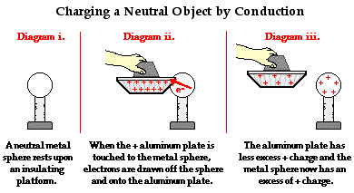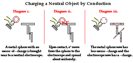 In the previous two sections of Lesson 2, the process of charging by friction and charging by induction were described and explained. In this section of Lesson 2, a third method of charging - charging by conduction - will be discussed. As was the case for charging by friction and charging by induction, the process of conduction will be described and explained using numerous examples of electrostatic demonstrations and lab experiments.