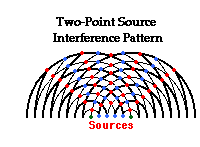 The diagram at the right depicts the pattern resulting from the propagation of water waves across the surface of the water. The waves propagate outward from the point sources, forming a series of concentric circles about the source. In the diagram, the thick lines represent wave crests and the thin lines represent wave troughs. The crests and troughs from the two sources interfere with each other at a regular rate to produce nodes (pictured in blue on the diagram) and antinodes (pictured in red) along the water surface. The nodal positions are locations where the water is undisturbed; the antinodal positions are locations where the water is undergoing maximum disturbances above and below the surrounding water level. One unique feature of the two-point source interference pattern is that the antinodal and nodal positions all lie along distinct lines. Each line can be described as a relatively straight hyperbola. The spatial separation between the antinodal and nodal lines in the pattern is related to the wavelength of the waves. The mathematical relationship will be explored later in this lesson. For now, we will investigate the underlying causes of this unique pattern and introduce some nomenclature (naming conventions) that will be utilized throughout the lesson.