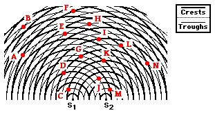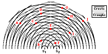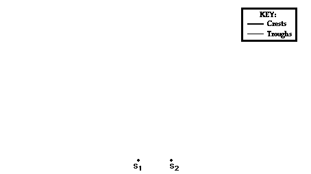 The animation below shows a series of concentric circles about two point sources (labeled as S1 and S2). The pattern could be the result of water waves in a ripple tank resulting from two vibrating sources; or the result of sound waves from two speakers traveling through a room; or the result of two light waves moving through a room after passing through two slits or pinholes in a sheet of paper. Like the diagram above, the thick lines represent wave crests and the thin lines represent wave troughs. The red dots in the animation represent the antinodal positions; the blue dots represent the nodal positions. The red lines drawn through the antinodal points (red dots) are referred to as antinodal lines and the blue lines drawn through the nodal points (blue dots) are referred to as nodal lines.