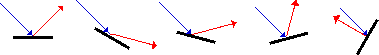 It was mentioned earlier in this lesson that light reflects off surfaces in a very predictable manner - in accordance with the law of reflection. Once a normal to the surface at the point of incidence is drawn, the angle of incidence can then be determined. The light ray will then reflect in such a manner that the angle of incidence is equal to the angle of reflection. This predictability concerning the reflection of light is applicable to the reflection of light off of level (horizontal) surfaces, vertical surfaces, angled surfaces, and even curved surfaces. As long as the normal (perpendicular line to the surface) can be drawn at the point of incidence, the angle of incidence can be measured and the direction of the reflected ray can be determined. A series of incident rays and their corresponding reflected rays are depicted in the diagram below. Each ray strikes a surface with a different orientation; yet each ray reflects in accordance with the law of reflection.