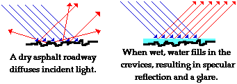There are several interesting applications of this distinction between specular and diffuse reflection. One application pertains to the relative difficulty of night driving on a wet asphalt roadway compared to a dry asphalt roadway. Most drivers are aware of the fact that driving at night on a wet roadway results in an annoying glare from oncoming headlights. The glare is the result of the specular reflection of the beam of light from an oncoming car. Normally a roadway would cause diffuse reflection due to its rough surface. But if the surface is wet, water can fill in the crevices and smooth out the surface. Rays of light from the beam of an oncoming car hit this smooth surface, undergo specular reflection and remain concentrated in a beam. The driver perceives an annoying glare caused by this concentrated beam of reflected light.