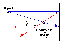 The goal of a ray diagram is to determine the location, size, orientation, and type of image that is formed by the concave mirror. Typically, this requires determining where the image of the upper and lower extreme of the object is located and then tracing the entire image. After completing the first three steps, only the image location of the top extreme of the object has been found. Thus, the process must be repeated for the point on the bottom of the object. If the bottom of the object lies upon the principal axis (as it does in this example), then the image of this point will also lie upon the principal axis and be the same distance from the mirror as the image of the top of the object. At this point the entire image can be filled in.