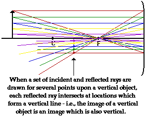 In this diagram five incident rays are drawn along with their corresponding reflected rays. Each ray intersects at the image location and then diverges to the eye of an observer. Every observer would observe the same image location and every light ray would follow the law of reflection. Yet only two of these rays would be needed to determine the image location since it only requires two rays to find the intersection point. Of the five incident rays drawn, two of them correspond to the incident rays described by our two rules of reflection for concave mirrors. Because they are the easiest and most predictable pair of rays to draw, these will be the two rays used through the remainder of this lesson.