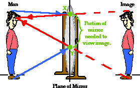 The diagram depicts some important information about plane mirrors. Using a cm-ruler, measure the height of the man (the vertical arrow) on the computer screen and measure the distance between points X and Y. What do you notice? The man is twice as tall as the distance between points X and Y. In other words, to view an image of yourself in a plane mirror, you will need an amount of mirror equal to one-half of your height. A 6-foot tall man needs 3-feet of mirror (positioned properly) in order to view his entire image.