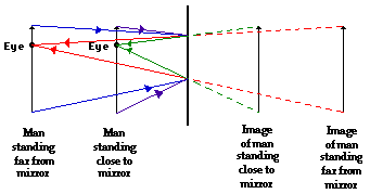 But what if the man stood a different distance from the mirror? Wouldn't that cause the man to need a different amount of mirror to view his image? Maybe less mirror would be required in such an instance? These questions can be explored with the help of another ray diagram. The diagram below depicts a man standing different distances from a plane mirror. Ray diagrams for each situation (standing close and standing far away) are drawn. To assist in distinguishing between the two ray diagrams, they have been color-coded. Red and blue light rays have been used for the situation in which the man is standing far away. Green and purple light rays have been used for the situation in which the man is standing close to the mirror.